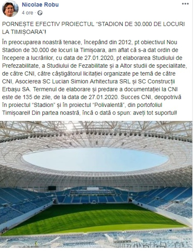 Termenul de elaborare și predare a documentației la CNI este de 135 de zile, de la data de 27.01.2020. Succes CNI, deopotrivă în proiectul “Stadion” și în proiectul “Polivalentă”, din portofoliul Timișoarei! Din partea noastră, încă o dată o spun: aveți tot suportul!”, a scris pe pagina sa de Facebook primarul din Timișoara, Nicolae Robu.