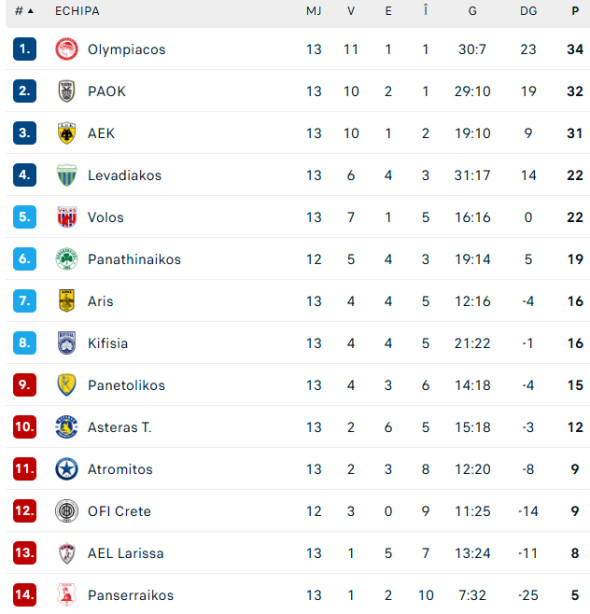 În clasament, pe primul loc se află Olympiakos Pireu, cu 34 de puncte, urmată de PAOK Salonic, 32 de puncte, AEK Atena, 31 de puncte, Levadiakos, 22 de puncte, etc. Panetolikos este pe 9, cu 15 puncte, iar Panserraikos este ultima (14), cu 5 puncte.