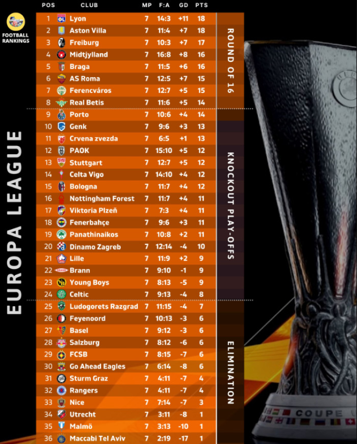 În urma acestui rezultat, FCSB se clasează pe locul 29 în clasamentul din Europa League, cu 6 puncte înregistrate. Gruparea roș-albastră păstrează șanse minime de calificare în primăvara europeană, înaintea meciului cu Fenerbahce din ultima etapă.