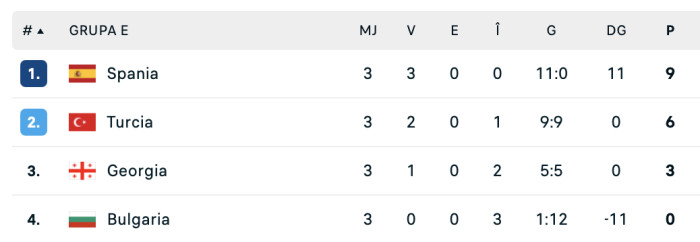 Turcia a ajuns la șase puncte din trei meciuri disputate și este pe locul doi în grupa E, la trei lungi sub liderul Spania, care are parcurs perfect. Chiar dacă au câștigat cu 6-1, turcii au golaveraj 0, pentru că etapa trecută au pierdut, 0-6, cu Spania.