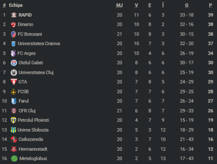 Clasamentul din SuperLiga României