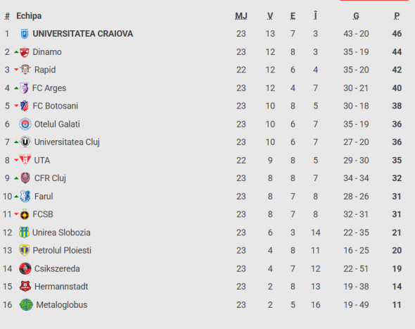 Clasamentul din SuperLigă. FCSB, pe locul 11 după 23 de etape