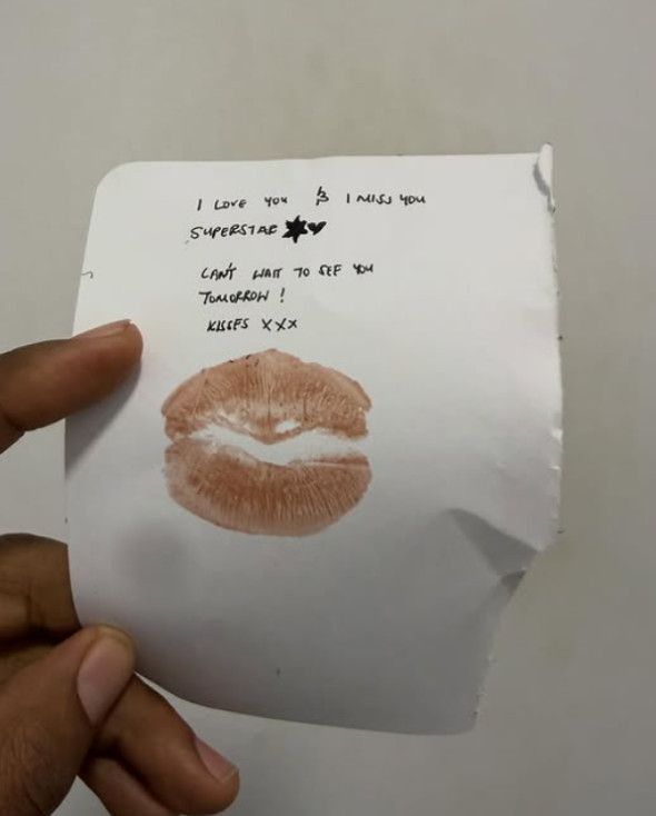 "Te iubesc și îmi e dor de tine, superstarule! Abia aștept să ne revedem mâine", scria în bilețelul primit de Ngezana de la soția sa.