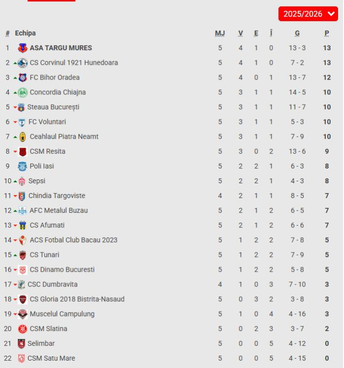 Clasamentul din Liga 2, după meciurile de duminică, 31 august 2025