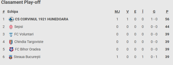 S-a terminat 1-0 pentru Corvinul, care face 56 de puncte și este deja cu un pas și jumătate în Liga 1. Steaua în schimb rămâne pe locul 6, cu 39 de puncte, fără drept de promovare.