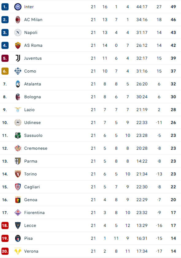 După eșecul împotriva lui Arsenal în Liga Campionilor, Inter se reîntoarce în cursa pentru ”Scudetto” din Serie A. Echipa antrenată de Cristi Chivu este lider după 21 de etape, cu 49 de puncte. Este urmată de Milan, cu 46 și Napoli, cu 43.