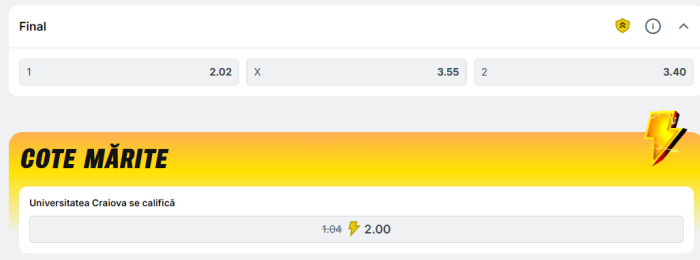 13.08.2025, 13:50Cum sună cotă 2.00 în loc de 1.04 pentru calificarea Universității Craiova în play-off-ul Conference League după 3-0 în turul cu Spartak Trnava? Nu e scenariu SF, e realitate pe Superbet, unde găsești o cotă de 1.90 ori mai mare decât punctul maxim al industriei pentru ca Mirel Rădoi și elevii săi să atingă ultima fază înaintea grupelor cupei europene.